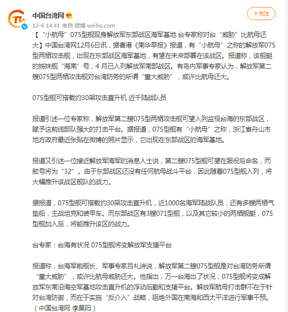 “小航母”075型艦現身解放軍東部戰區海軍基地,台專家稱對台“威脅”很大分享到: