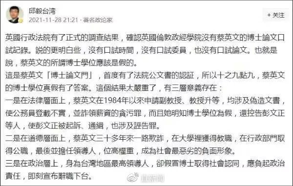 ▲11月28日晚間,台灣地區前民意代表、名嘴邱毅發文截圖。 蔡英文“論文門”到底咋回事? 這還得從2019年她被揭發的論文“離奇失蹤”說起。 蔡英文一直聲稱自己是英國倫敦政經學院的法學博士,研究的課題是《不公平貿易行為與保障措施》,在1984年正式“取得”了博士學位。按照正常程序,蔡英文在1984年博士畢業時的論文,作為學術成果,應該被保留在母校。但是,倫敦政經學院,以及聯盟學校倫敦大學,三個圖書館,都找不到她當初的論文。只有她在2015年補交的一份。 蔡英文後來專門為此舉辦記者會,但拿出來為自己表明清白的,只是一張一張的“論文原稿”,根本不是原本應該由口試委員簽名的那份博士論文版本。