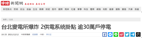 綜合“中時新聞網”和“聯合新聞網”等台媒消息,台北市文山區一變電站今天(12日)早上傳出爆炸聲,導致台北市和新北市多地停電。台電稱,此次事故初步評估有30萬用戶停電或電壓下降,正在全力搶修中。