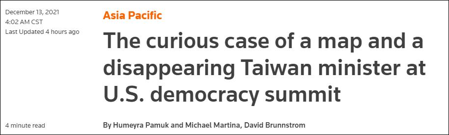 路透社報道截圖 在上周五的“民主峰會”視頻會議中,台灣“數字部長”唐鳳發表演講時,引用了南非一家非政府組織的彩色編碼地圖,這張地圖依據所謂“公民權利開放程度”進行排名,將大陸和台灣標注為兩種顏色。 路透社稱,這張地圖在唐鳳的演講視頻中出現了一分鐘,讓一眾美國官員“驚慌失措”(consternation)。幾分鐘後,當鏡頭從主持人再度切回唐鳳時,她的視頻畫面已經被掐斷,改為音頻代替,屏幕上只剩下了“部長奧黛麗·唐”的字樣。隨後,屏幕上還出現了免責聲明,“本小組個人所表達的任何意見都僅屬個人,不一定反映美國政府的觀點。”