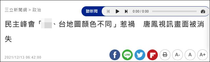 唐鳳視頻畫面被掐 由於此事的敏感性,一位不願透露姓名的消息人士稱,台灣代表唐鳳的視頻信號被掐,是白宮方面的要求。白宮擔心在美國舉辦的會議上,赫然出現區隔中國大陸和台灣的地圖,可能會被視為與華盛頓的“一個中國”政策相違背。據悉,這張地圖在美國官員中引發了一場“電子郵件風波”,白宮國家安全委員會憤怒地聯繫了美國國務院,似乎擔心這張地圖會讓台灣被認為是一個獨立國家。 白宮方面沒有就此事發表任何評論,美國國務院發言人則回應稱,是屏幕共享的“混亂”導致唐鳳的視頻被刪除,並說這是一個“無心之失(an honest mistake)。” 該消息人士談及白宮的反應時說道,“他們被氣得說不出話來(choked)。”他表示,美國國家安全委員會對此事很生氣,因為這張地圖在峰會前的演練中沒有出現,讓人懷疑台灣和唐鳳是否是有意在最後一刻搞小動作,發出這樣的信息。