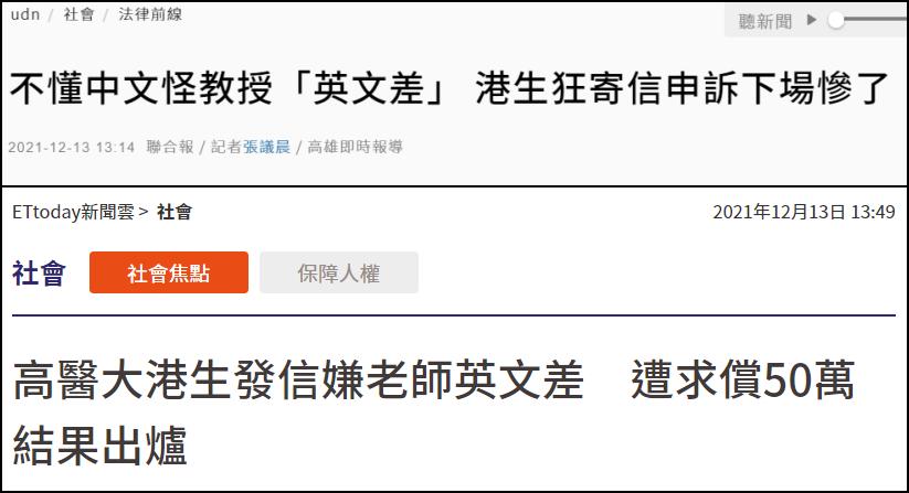 台媒報道截圖 綜合台灣“聯合新聞網”和“ETtoday新聞雲”13日報道,高雄地方法院的判決指出,就讀台灣高雄醫學大學心理系研究所的芮姓研究生,選修了蘇姓助理教授開設的“心理衡鑒專題研究”和“咨商與心理治療實務專題研究”兩門課,蘇姓助理教授在課堂用中文授課,芮姓學生稱難理解上課內容,於是就課堂內容向學校學生申訴評議委員會申訴,指控蘇姓助理教授“英文能力不佳”。 然而芮姓研究生申訴完後,認為上課環境沒有改善,2019年7月10日起,開始給校長、教務長、蘇姓助理教授等人連發多封電子郵件,稱“本人因未能聯絡蘇文碩博士,我已發超過100封電郵及提醒了他超過22次”、“我希望教務處能幫助聯絡蘇文碩博士,也可以還蘇博士一個清白的機會”。 在郵件中,芮姓研究生不僅稱蘇姓助理教授“英文程度低”“Poor English”,給蘇姓助理教授的郵件中還直接嗆“你的英文很爛”,並諷刺稱:“如果你不懂英文,這一句我寫中文給你……” 芮姓研究生除了將郵件發給校長等人外,郵件副本還抄送給校內其他學院院長、教授及行政人員等,超過百人。