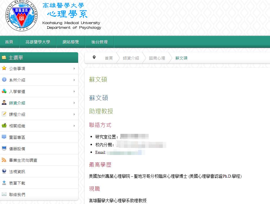 台灣高雄醫學大學 值得注意的是,在高雄醫學大學心理學系官網,這位蘇姓助理教授的最高學歷是“美國加州職業心理學學院聖地亞哥分校臨床心理學博士”。該學校由加州心理學協會於1969年創立,是營利性私立學校亞萊恩國際大學的組成部分,博士項目由美國心理學協會認證。