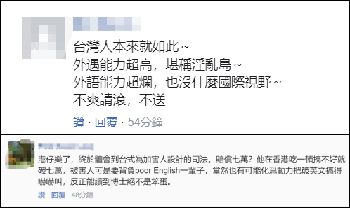 台媒:香港學生不懂中文投訴台灣教授“英文爛” ,結果被判賠償7萬新台幣據台媒12月13日報道,一名來自香港、在台灣高雄醫學大學攻讀心理系碩士的芮姓男同學,因為不滿蘇姓助理教授上課頻用中文讓他難理解,連續發多封電子郵件給校長、教務長,質疑蘇“英文程度低”“Poor English ”,郵件還抄送給院長、行政人員、系所教授等百余人。 結果,被投訴的助理教授不滿名譽受侵害直接把這名香港學生告上法庭,要求賠償50萬新台幣(約合11.5萬元人民幣)還要求其在台灣地區四大報頭版刊文道歉,高雄地方法院最後判決芮姓研究生賠7萬新台幣(約合1.6萬元人民幣),但不需登報道歉,可上訴。