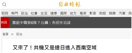 島內綠媒《自由時報》14日報道宣稱,解放軍軍機近期連續“襲擾”台灣“西南空域”,從11月至今僅本月12日未“擾台”,“這兩天又密集進入‘西南空域’”。