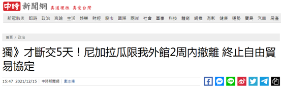 台灣“中時新聞網”報道截圖 報道稱,過去台灣“邦交國”“斷交”後,雙方多少都會顧及過去情面,至少給予一個月的時間,讓台駐當地機構處理相關的館產、車輛、宿舍以及人員等後續事宜,但這次奧爾特加卻罕見地直接下令只給不到兩周的時間讓台當局駐當地機構撤離,顯見雙方關係已降至冰點。報道提到,尼加拉瓜宣布與台灣“斷交”後,外界關註此前雙方在2006年6月所簽訂的“自由貿易協定”,這項協定在2008年1月1日正式生效。 有消息人士透露,據尼加拉瓜當地媒體報道,奧爾特加已經在當地時間14日簽署法令,下令取消此前與台當局簽署的“自由貿易協定”,主要目的是不想再和台當局有任何牽連。 台外事部門回應稱,尼加拉瓜政府日前在與台駐當地機構協商撤館過程中,已口頭要求台駐當地機構及技術人員在2021年12月23日前撤離尼加拉瓜。 尼加拉瓜外交部9日發表聲明,宣布與台灣斷絕“外交關係”。聲明表示,世界上只有一個中國,中華人民共和國是代表中國的唯一合法政府,台灣是中國領土不可分割的一部分。尼加拉瓜自即日起斷絕與台灣的“外交關係”並停止與台灣的一切接觸和官方聯係。 【編輯:凌玉辉】