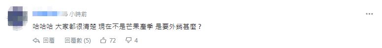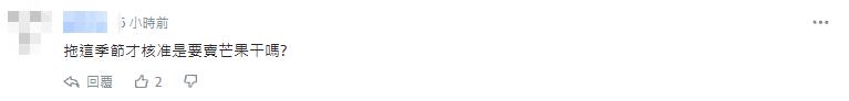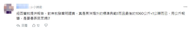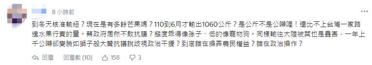 有網友更指出,台灣輸往大陸一年上千噸水果,2021年到6月才輸出1060公斤芒果到新西蘭! “是公斤不是公噸喔!還比不上台灣一家路邊水果行賣的量。蔡政府居然不敢抗議?態度乖得像孫子、低得像寵物狗……到底誰在操弄農民權益?誰在政治操作?” “(輸出水果有蟲害被禁)新西蘭就提供報告,對岸就發聲明譴責,真是崇洋媚外的標準典範!!!而且用公斤報道,是要愚弄民眾嗎!?”