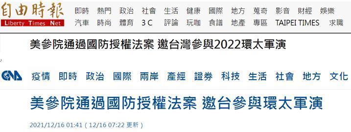 夾帶涉台私貨,渲染中俄“威脅”的美國2022財年國防授權法案,在參議院獲得通過後,“中央社”、《自由時報》等多家台媒今日(16日)一早炒作,法案建議美國防部邀台灣參與2022年環太平洋軍演,並鼓動“制定計劃協助台灣強化不對稱防衛能力”。有島內網友對此表示,這是“搶錢及炮灰法案。”