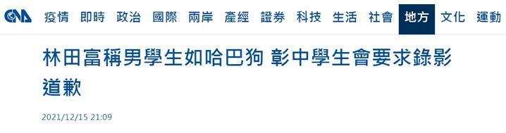 台灣“中央社”報道截圖 報道稱,彰化女子高中本月4日舉行102周年校慶暨運動大會,林田富出席上台致詞說:“我剛剛走進校門看到,彰中(彰化高中)一群小夥子在外面,跟一群哈巴狗一樣”。