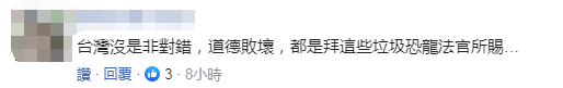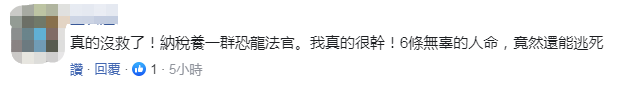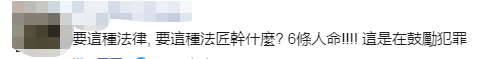還有人稱,“台灣沒是非對錯,道德敗壞,都是拜這些垃圾恐龍法官所賜。”“要這種‘法律’,要這種法匠(法官)幹什麽?6條人命!這是在鼓勵犯罪。”
