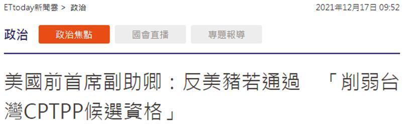 果然開始威脅了,美前官員宣稱“反萊豬”若通過可能削弱台灣參與CPTPP資格分享到: