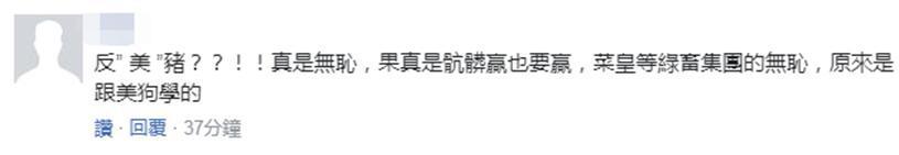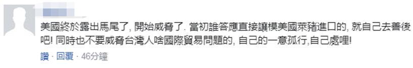 還有人稱,“美國終於露出馬尾了,開始威脅了,當初誰答應直接讓美國萊豬進口的,就自己去善後吧!同時也不要威脅台灣人啥國際貿易問題的,自己的一意孤行,自己處理!”