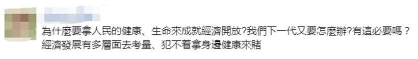 還有網友質疑,“為什麽要拿人民的健康、生命來成就經濟開放?我們下一代又要怎麽辦?有這必要嗎?經濟發展有多層面去考量,犯不著拿身邊健康來賭。”