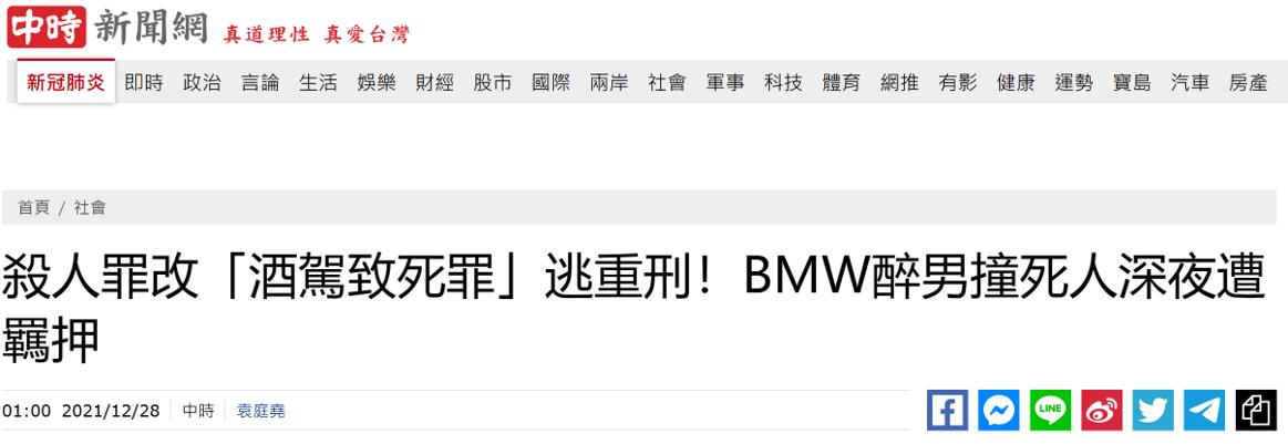 台灣“中時新聞網”報道截圖 據報道,台灣“刑法”規定,酒駕致人於死者,處3年以上10年以下有期徒刑;致重傷者,處1年以上7年以下有期徒刑。黃姓男子酒駕造成一死三重傷的慘劇,未來最重上限僅10年,逃過10年以上刑期殺人重罪。但屆時是否更改法條,島內不是沒有判例,一切仍待法官決定。