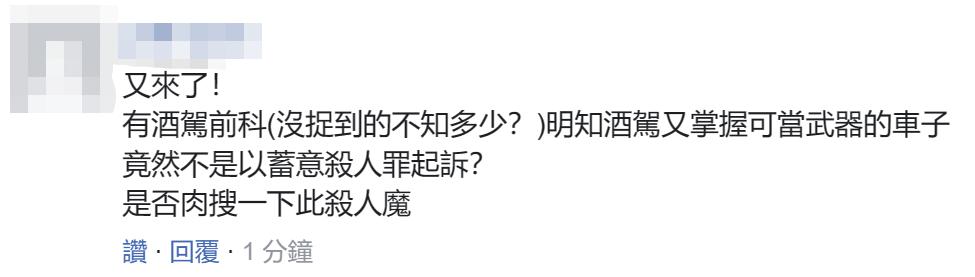 黃姓男子27日被高雄地檢署依殺人罪申押禁見,高雄法院深夜按“酒駕致死罪”將其羈押。圖源:台灣“中時新聞網” 報道稱,黃姓男子當庭承認,事發當時他已經過度酒醉、意識根本不清楚,只依稀記得當時車速大概七、八十公里。他辯稱,接近路口前,前方有輛白車、慢速度阻擋他的去路,也遮蔽他的視線,他才會從白車右後方強行超車。 當時,林姓男子一家四口正手牽手、跨越馬路,被黃男駕駛的寶馬車高速撞上,造成林姓男子骨盆骨折,範姓妻子當場重傷不治,14歲和15歲2名女兒分別受有四肢擦挫傷、雙小腿骨折全口牙脫落等傷勢。 檢方稱,審訊後認定黃姓男子有逃亡、串證之虞,向法院申請羈押禁見。黃姓男子2006年、2009年均曾因酒駕案件被逮,仍心存僥幸,明知個人因飲酒已達嚴重酒醉無法安全駕駛的狀態,無法遵守、辨識道路交通標誌及註意車前狀況,不顧其他路人可能被其駕車撞擊致死傷,酒後開車上路,撞擊林姓男子一家4人,致範姓女子送醫後不治死亡,其余3人則分別受有輕重傷,經警到場處理,並測得被告吐氣酒精濃度高達每公升1.24毫克。 檢方調閱監視器畫面發現,黃姓男子為自己辯解的內容根本胡扯,事發當時根本沒車擋他,案發現場當時都是人車,黃姓男子在毫無減速的狀況下、直接撞上過馬路的林家人,酒測值高達1.24,根本不知道自己已闖下大禍。 對於酒駕撞飛一家四口導致1死3傷並有前科的黃姓男子可能逃避重刑,有島內網友質疑,“又來了!有酒駕前科(沒捉到的不知多少?)明知酒駕又掌握可當武器的車子,竟然不是以蓄意殺人罪起訴”?↓
