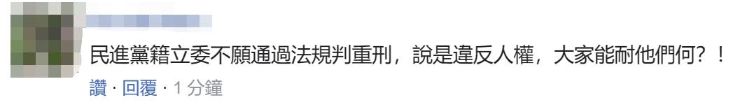 還有網友無奈表示,“民進黨籍‘立委’不願通過法規判重刑,大家能耐他們何?!”↓
