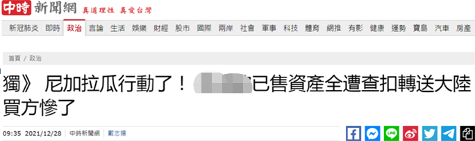 台灣“中時新聞網”報道截圖 尼加拉瓜政府本月9日宣佈與台灣“斷交”並要求其駐該國的“大使館”及工作人員於23日之前撤離,而懷恨在心的台當局在撤離前“留了一手”:將“使館館舍”捐贈給反政府的馬那瓜天主教會。美媒27日稱,台灣此舉讓馬那瓜天主教會與尼加拉瓜總統奧爾特加政府的對峙再次升級。尼加拉瓜政府26日晚對此作出憤怒反應,宣佈沒收台“館舍”資產,按照該國法律移交中國大陸。民進黨當局27日對此表示“無法接受”及“強烈抗議”。