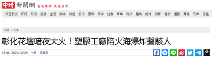 台灣“中時新聞網”報道截圖 彰化縣消防局第表示,28日晚間22時44分獲報花壇鄉一工廠發生火災,已派出6個消防分隊各式消防車輛29輛,58名消防人員前往現場全力撲救,並且仍在加派人車到場支援。
