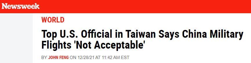 美國《新聞周刊》報道截圖 台灣省綠媒“新頭殼”報道稱,“美國在台協會(AIT)”27日晚間在官方臉書粉絲團貼文表示,新上任的AIT處長孫曉雅首次接受台灣YouTuber阿滴的專訪、回答網友問題。 報道稱,被問及對所謂中國大陸軍機“不斷升級”的行動有何看法時,這位“美國在台協會”一把手馬上渲染說,美方認為這些“侵犯台灣領空”的行為會破壞地區穩定,也可能造成錯估情勢的風險。