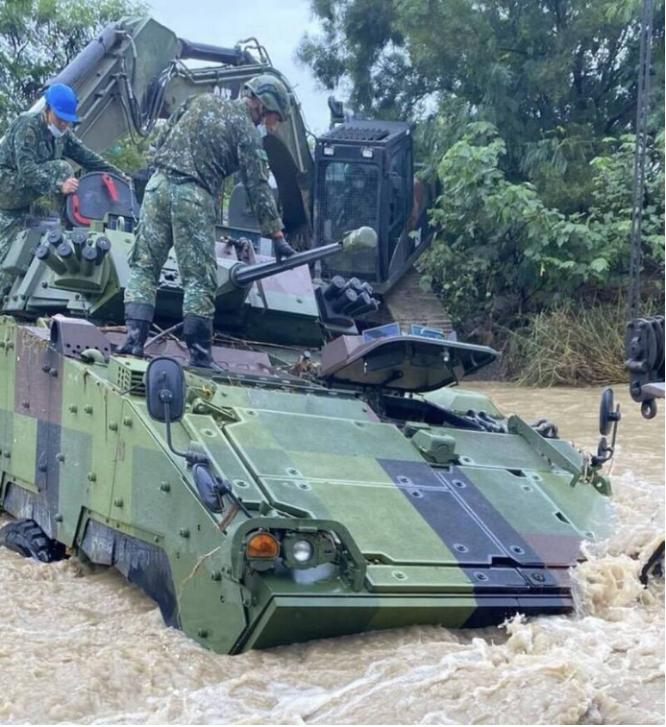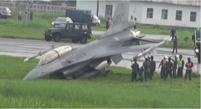 “雲豹”裝甲車卡在溪中。圖源:台灣《自由時報》 8月11日,台空軍一架從嘉義基地起飛的F-16V戰機起飛時座艙罩脫落,起飛一半變敞篷; 8月31日上午,台軍一架F-16戰機在屏北機場進行戰備道起降演練時突然滑出跑道,戰機機頭直接“吃土”,後調查初步認定是人為操控因素。