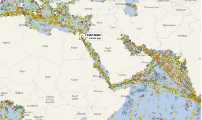 “長賜”號3月23日凌晨起卡在埃及蘇伊士運河。圖源:台灣“中央社”