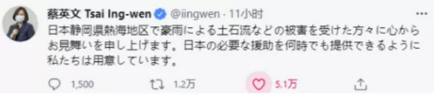 除了“哭”拜登死去的狗,蔡英文還在這些場合出現過: 發帖慰問日本靜岡遭受泥石流的人:7月3日,日本靜岡縣發生大規模泥石流,多人下落不明。當日21時許,蔡英文在推特以日文發帖,“向在日本靜岡縣熱海地區遭受泥石流的人們表示最深切的慰問”,稱“台灣隨時準備向日方提供必要的幫助”。↓