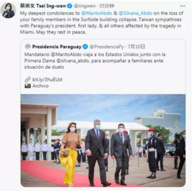 對遇刺身亡的海地總統迅速表達悲痛:7月7日,民進黨當局“友邦”海地總統若弗內爾·莫伊茲遇刺身亡的消息傳到島內,蔡英文迅速在推特發文悼念。她寫道:“我代表台灣人民和政府,對海地總統若弗內爾·莫伊茲的死表示哀悼。我們祝願第一夫人早日康復,並在這一困難時期與我們的‘盟友’海地同在。” 悼念“友邦”巴拉圭總統——夫人——的妹妹一家:巴拉圭第一夫人的妹妹索菲亞7月8日被證實在美國邁阿密瑟夫賽德鎮6月發生的大樓坍塌事件中遇難,索菲亞的丈夫和他們最小的孩子遺體也被找到。巴拉圭總統府推特賬號7月10日發佈推文稱,巴拉圭總統馬裏奧·阿布鐸與第一夫人西爾瓦娜·阿布鐸一起赴美,在悲痛中陪伴家人。 7月12日,蔡英文轉發上述推文並稱:“向馬里奧·阿佈鐸及西爾瓦娜·阿布鐸在瑟夫賽德鎮大樓倒塌事件中失去你們的家人致以最深切的哀悼。”↓