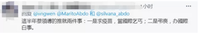 對於蔡英文的不斷吊喪,有島內網友這樣總結:“這半年蔡領導的推(特)就兩件事:一是求疫苗,當國際乞丐;二是吊喪,辦國際白事。”↓