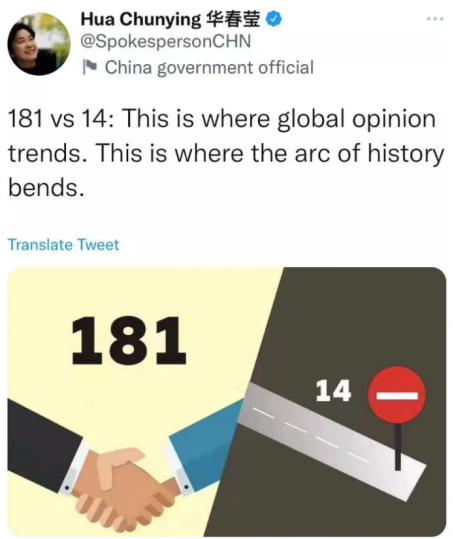 12月10日,中國同尼加拉瓜在天津簽署《中華人民共和國和尼加拉瓜共和國關於恢復外交關係的聯合公報》。圖源:新華社 當天,外交部部長助理華春瑩在推特上發了一張意味深長的對比圖,並寫道:“181vs14:這就是世界人心所向,這就是歷史大勢所趨。”↓