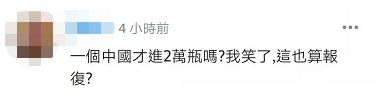 而對於台媒的“報復”一說,有網友質疑,“一個中國才進2萬瓶嗎?我笑了,這也算報復?”“美國的經濟制裁叫制裁,大陸的經濟制裁叫報復?”“立陶宛就沒有惡意對中國嗎?” ↓