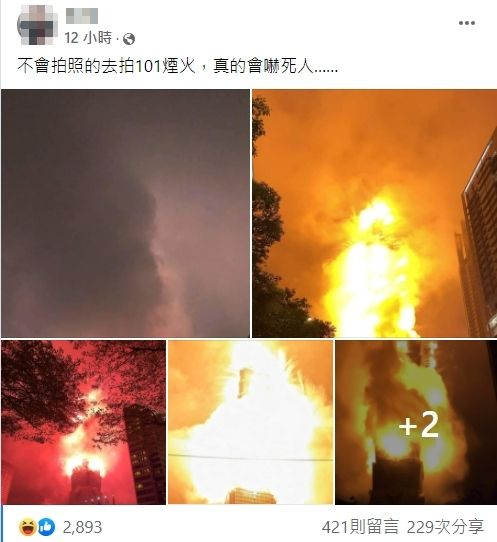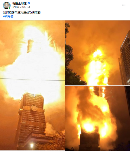 煙火噴發那一瞬間看起來像火災(圖片來源:台媒) 報道稱,一名網友在臉書社團“爆廢公社”轉貼網友分享的煙火照,煙火爆炸那一瞬間,黃色、紅色火光瞬間從建築物噴出,遠看就像是火焰圍繞著整個101大樓,煙火爆開那一瞬間剛好被民眾給拍下,其實下一秒就煙花四射,但剛噴發的那一幕看起來相當驚悚。 “ETtoday新聞雲”註意到,一些網友在帖文下言紛紛留言回復,“好像爆炸”;“沒說跨年活動,以為發生什麽事了”;“為什麽看起來像是恐怖襲擊”;“真正的拍照高手才能拍出這樣的照片”;“是煙火還是失火”。 臉書粉絲專頁“電腦王阿達”1日晚也轉發網絡上流傳的照片,並配文“如何把跨年煙火拍成恐怖攻擊”,吸引眾多網友圍觀。