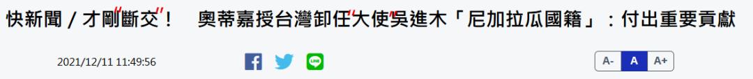 右一為吳進木 截圖自綠媒 01 綠營稱台出了“叛徒” 根據官方資料,吳進木於2007年至2011年,以及2017年至2021年,兩度擔任台當局“駐尼加拉瓜代表”。 去年(2021年)9月28日,他以“個人生涯規劃”為由向台當局申請退休,獲準後於該年11月17日正式離任。離任不到一個月,12月9日,尼加拉瓜宣佈與台灣“斷交”。 而就在尼加拉瓜火速趕人,罕見口頭通知台當局派駐人員限期撤離的情況下,該國政府公報在“斷交”第二天(10日)宣佈授予吳進木夫婦尼加拉瓜國籍,指其符合取得尼加拉瓜公民身份的規定和法律程序,還稱其14年來對尼加拉瓜的社會、經濟、科技、教育和文化發展貢獻良多。 這事一開始在島內輿論中被視為一個正面事例,台媒無不在報道中強調此舉是尼加拉瓜感謝吳進木為兩地友誼所做出的貢獻,還將夫婦倆在去年11月退休前曾獲得該國馬納瓜市政府頒發的“傑出人士”頭銜也舊事重提一番,看起來多少有些在為“斷交”一事挽回顏面的意思。