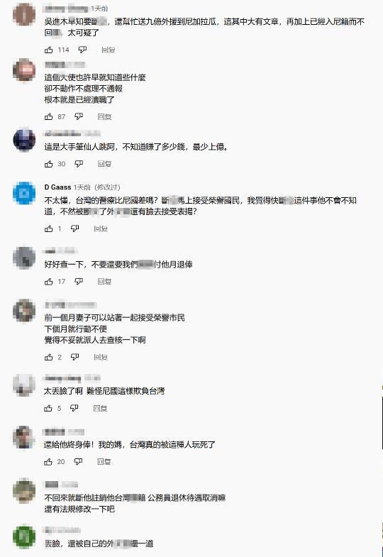 但當最近吳進木“不返回台灣”的消息傳出後,綠媒和綠營突然覺得這事“不簡單”了。 1日,綠媒捋了一遍時間線,稱“吳進木9月申請退休、11月離任、12月‘斷交’後就入籍且不返台”,直呼“時機點好巧?”。報道中還懷疑吳進木其實早就申辦了入籍手續,暗示他可能早就知道尼加拉瓜要與台灣“斷交”,指其存在瀆職嫌疑。 綠營方面也破防了,大罵吳進木是“棄台不顧的叛徒”。台媒3日報道稱,前民進黨“立委”、“台獨”大佬林濁水認為吳進木的一連串舉動“不合理”,發文稱其“斷交”前辦退休,剛“斷交”就入籍,“斷交”前報回的都是好消息,而“斷交”後又不返台匯報。 他怒斥吳進木此舉是“背叛台灣”,喊話台當局對其即刻展開調查,並追回退休金,“太不像話了!還不認真追查?鳴鼓而攻之!‘銓敘部’(台人事部門)馬上先追回退休金!” 02 剛丟完“邦交”,現又丟“大使” 民進黨“立委”林淑芬日前就此事質詢台灣外事部門負責人吳釗燮,批評吳進木不返回台灣的做法不符合島內相關保密條例規定,要求外事部門給出回應。 報道稱,按照台灣地區的相關規定,像吳進木這樣的工作人員屬於“法定涉密人員”,在離職、退職或移交機密未滿三年時出境會受到管制。林淑芬表示,吳進木在外國辦理退休且不回台灣已經違反了這條規定,可能會造成機密保護漏洞,讓相關法律途有形式。 吳釗燮1日對此解釋稱,吳進木的確屬於涉密人員,受到相關法律的約束,但他目前是因為要照顧行動不便的夫人才無法返台。他也承認從此事中可以看出相關規定的確存在不足,會檢討並做出更嚴謹的修改。 “吳進木的妻子上個月接受表彰時還身體健康,這個月就行動不便了?”顯然對於這番說辭,島內一些民眾並不買單。 在一片噓聲中,也有不少人要求台當局沒收吳進木的退休金,還有者哀嚎道“這是大手筆‘仙人跳’”、“被‘斷交’已經很丟人了,沒想到還被自己的外事官員擺了一道”。