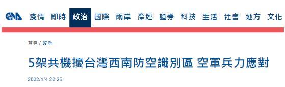 台媒緊盯:5架解放軍軍機昨天進入台灣西南“防空識別區”分享到: