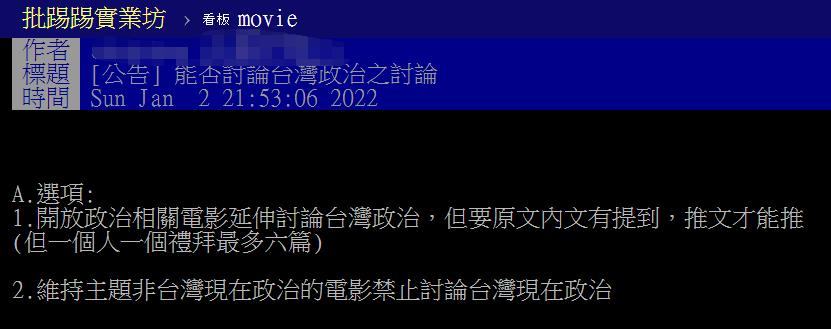 報道稱,對於電影內容激烈的討論,也讓PTT電影板板主臨時修板規,讓網民投票決議“板上開放政治相關電影延伸討論台灣政治,但要原文內文有提到,推文才能推”或“維持主題非台灣現在政治的電影禁止討論台灣現在政治”。