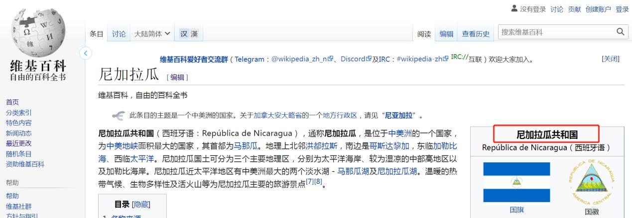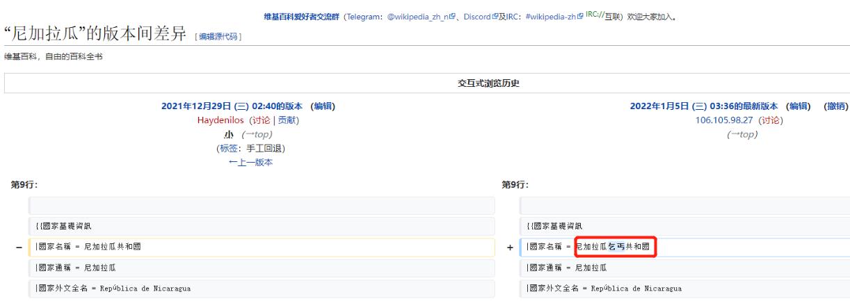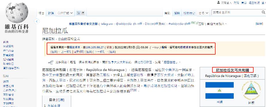 記者查詢維基百科關於尼加拉瓜的編輯記錄,確實發現尼加拉瓜5日一度被修改成“尼加拉瓜乞丐共和國”。 維基百科的頁面上如今出現這樣的解釋字眼:“這是本頁的一個歷史版本,由106.105.98.27(留言)在2022年1月5日 (三) 03:36 (→top)編輯。這可能和目前版本存在著巨大的差異。”↓