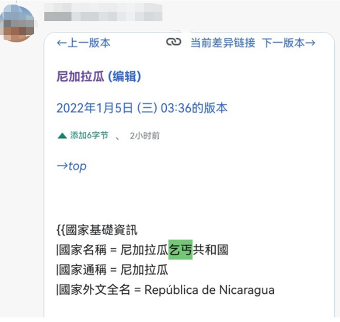 不過,有不少網友在“範靈犀 Xi Fan”的爆料推文下,曬出了維基百科關於“尼加拉瓜”不同版本間的差異。2021年12月29日2時40分的版本正常顯示為“尼加拉瓜共和國”,但2022年1月5日3時36分的版本,則被修改成“尼加拉瓜乞丐共和國”。↓