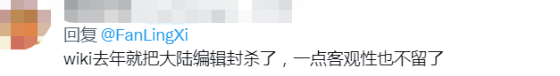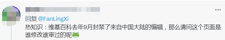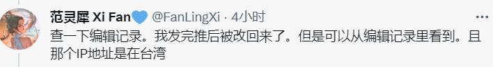 “範靈犀 Xi Fan”也回復網友稱,可查一下維基百科編輯記錄,並稱其發完推後被改回來了,“但是可以從編輯記錄里看到。且那個IP地址是在台灣。”↓