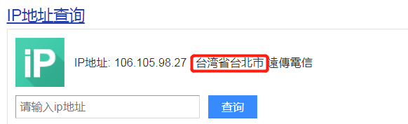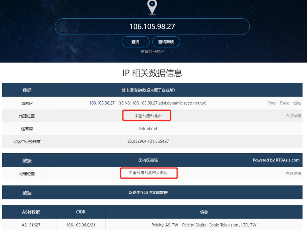 記者在不同的IP地址查詢網站查詢,發現“106.105.98.27”這個IP地址確實來自台灣。↓