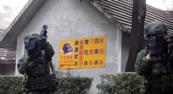 台軍訓練場內商店招牌 圖片來源:中央社 在台軍高雄步兵訓練指揮部後山,有一處占地約7000平方米的“街區型”訓練場,內含26棟高度不一的建築,台軍為求“真實”,在建築物外牆上加裝都會區常見商店的招牌,例如屈臣氏、7-11、星巴克等,有些建築則加裝小吃店、刨冰店菜單看板。