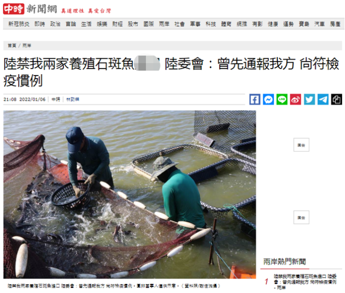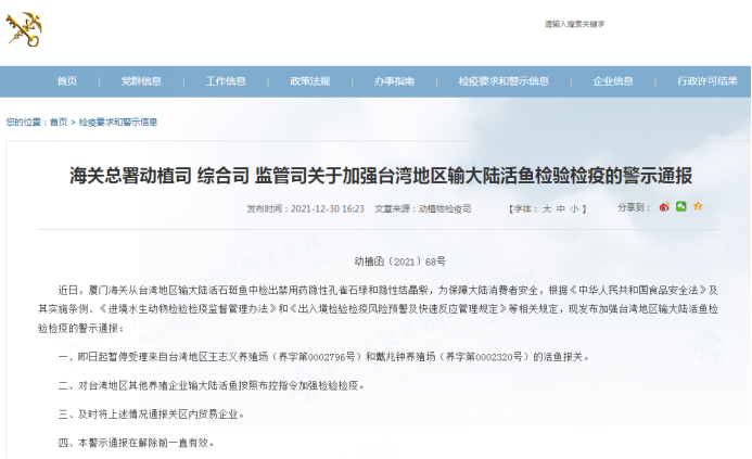 台灣“中時新聞網”報道截圖 陸委會稱,大陸海關總署於2021年12月30日發布“關於加強台灣地區輸大陸活魚檢驗檢疫的警示通報”,大陸海關總署已於2021年12月27日通過“海峽兩岸農產品檢疫檢驗合作協議”平台通報台灣“防檢局”,其廈門海關從台灣輸往大陸的活石斑魚中檢出禁用藥及藥檢超標,請台灣暫停檢出禁用藥物的養殖場輸出大陸,並請台灣展開調查及回復。 大陸海關總署動植司、綜合司、監管司發布關於加強台灣地區輸大陸活魚檢驗檢疫的警示通報。通報指出,即日(2021年12月30日)起暫停受理來自台灣地區王誌義養殖場和戴兆鐘養殖場的活魚報關,對台灣地區其他養殖企業輸大陸活魚按照佈控指令加強檢驗檢疫。
