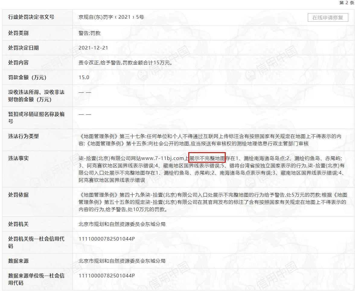 汪文斌:我不掌握妳提到的情況。我願重申,台灣是中國領土不可分割的一部分,一個中國原則是公認的國際關系準則和國際社會普遍共識。 根據國家公共信用信息中心“信用中國”網站公示,柒-拾一(北京)有限公司因違反《地圖管理條例》,在網站展示不完整地圖、標註含國家有關規定在地圖上不得表示的內容,被北京市規劃和自然資源委員會東城分局罰款15萬元。 其中“違法事實”部分寫道,柒-拾一(北京)有限公司網站www.7-11bj.com上展示不完整地圖存在1、漏繪南海諸島島點;2、漏繪釣魚島、赤尾嶼;3、阿克賽欽地區國界線表示錯誤;4、藏南地區國界線表示錯誤;5、錯將台灣省按獨立國家表示的行為,柒-拾一(北京)有限公司入口處展示不完整地圖存在1、漏繪釣魚島、赤尾嶼;2、南海諸島島點表示有誤;3、藏南地區國界線表示錯誤;4、阿克賽欽地區國界線表示錯誤。 《地圖管理條例》第四十九條柒-拾一(北京)有限公司入口處展示不完整地圖的行為給予警告,處5萬元的罰款;根據《地圖管理條例》第五十五條的規定柒-拾一(北京)有限公司在其官網發布的標註了含有按照國家有關規定在地圖上不得表示的內容的行為,給予警告,處10萬元的罰款。 【編輯:余翔】