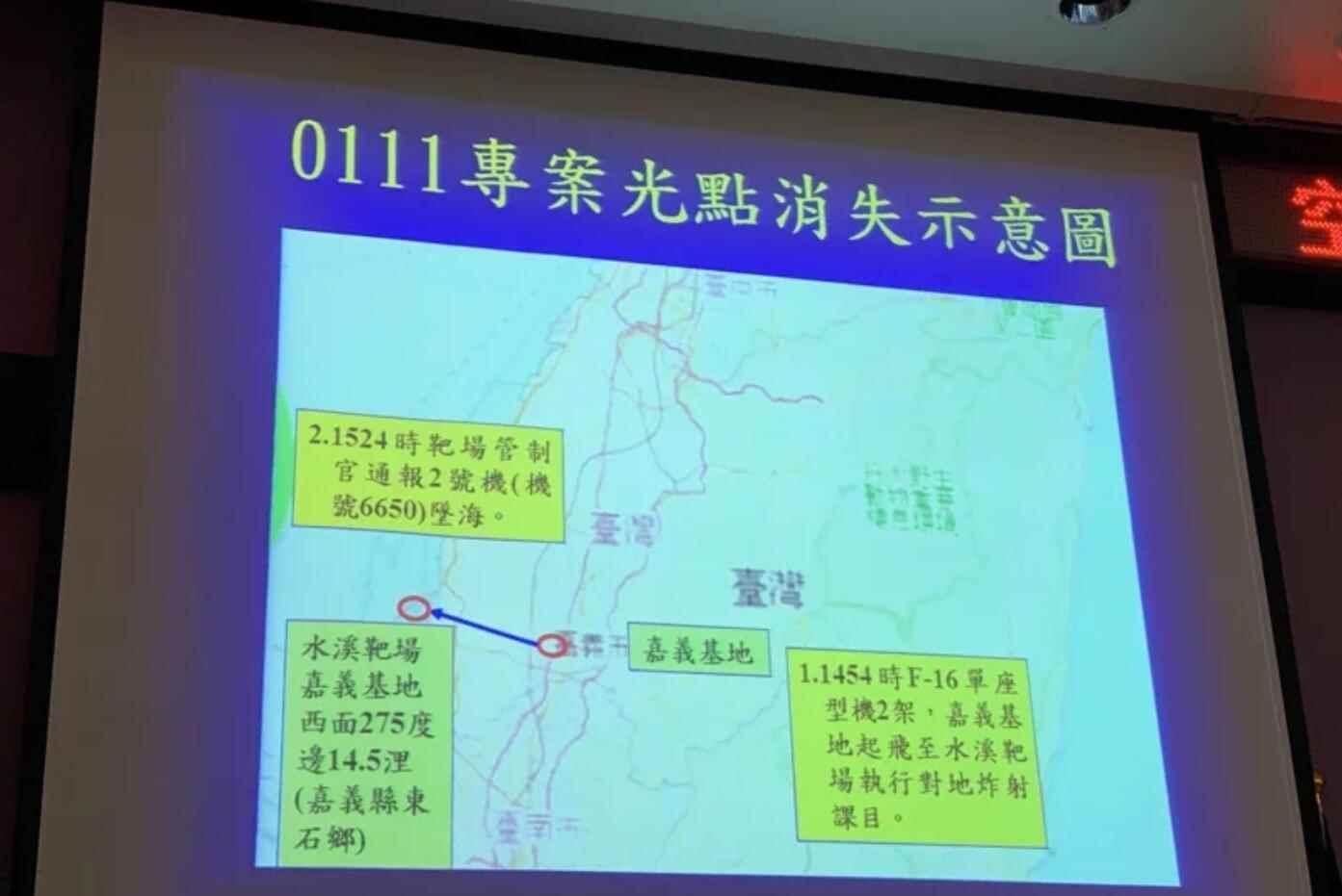 失聯飛行員 據台灣聯合報消息,台空軍司令部1月11日晚召開臨時記者會,空軍司令部參謀長柳惠千表示,台空軍四聯隊所屬F16VBLK20型機一批2架,昨日下午升空執行基本對地炸射,戰機14時54分自嘉義基地起飛後,15時23分飛行員陳奕駕駛的二號機於水溪靶場靶標北面約100公尺墜海。他說,當時的天氣情況符合課目天氣標準。 柳惠千提及,這項科目是戰機須由8000尺高度翻身向下建立下滑角度,必須設定正確角度,這項科目要經常訓練,機腹朝上是標準大角度建立姿態的動作。 柳惠千表示,陳奕上尉居住南投縣,未婚,有女友,其為是台空軍官校106年班畢業,現任第四聯隊第21作戰隊上尉飛行官,其於109年3月16日任職,飛行總時數有321余小時,F-16V機種飛行時間則有60.05小時,目前仍為僚機資格,其體檢、航空生理、求生訓練均合格。 柳惠千表示,事發後台空軍下令嘉義搜救機U-60M於15時38分起飛,15時48分到達目標區執行搜救。15時34分轉用在空EC225搜救機到達目標區執行搜救。16時52時空作部下令,17時25分第六聯隊C-130型機赴現場,協助空中照明。17時24分嘉義基地S-70C-6起飛,至目標區進行搜救。他強調搜救將日夜進行。 柳惠千說,事發後台空軍副司令進駐戰情中心開設緊急應變中心,16時台空軍司令率相關業參赴嘉義基地台空軍司令部督察長室調查專案小組赴現場。台空軍司令部則下令-16型機部隊“天安一號”,暫停全部戰演訓任務。