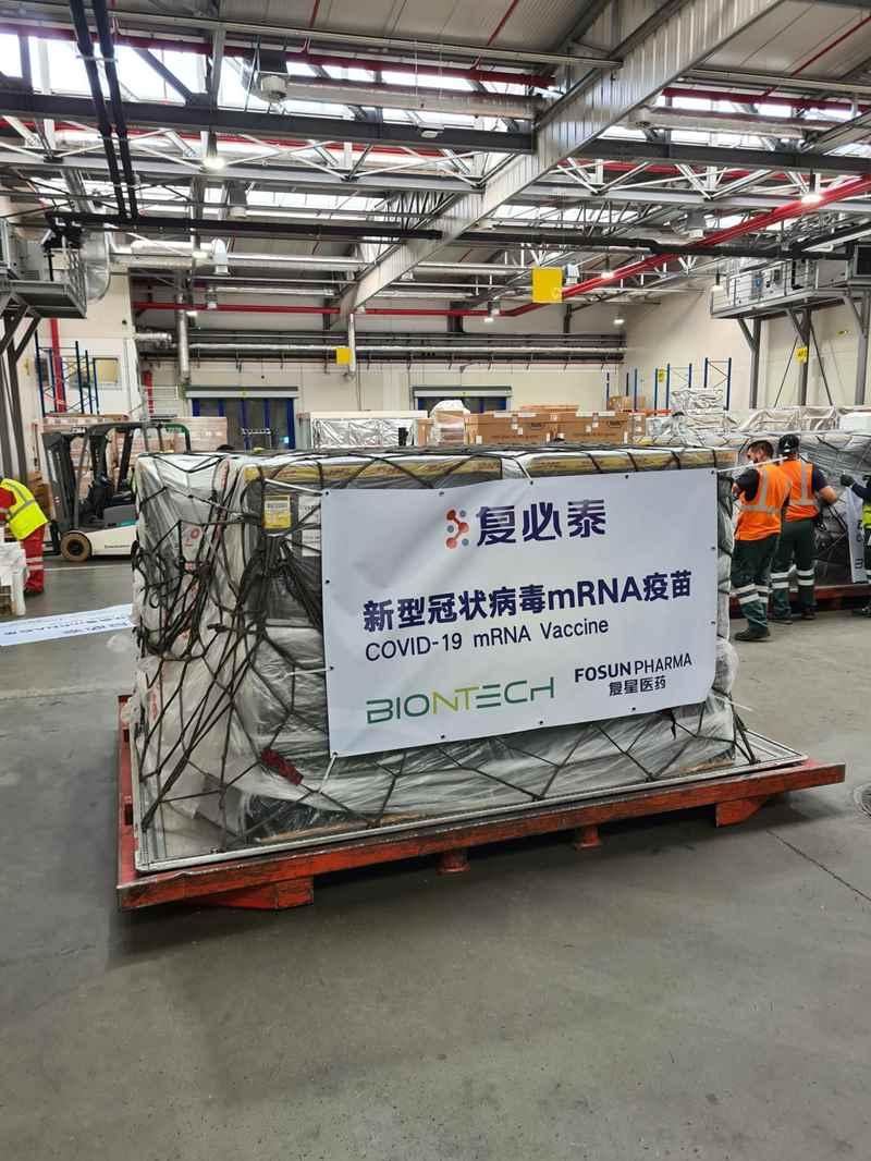 2021年9月1日。上海復星醫藥供應台灣地區首批復必泰疫苗在盧森堡啟運。 中新社圖片 對此,朱鳳蓮表示,我們一再強調,大陸方面高度重視台灣同胞的生命健康福祉,始終秉持“像為大陸百姓服務那樣造福台灣同胞”精神,協助島內民眾應對疫情。我們一直支持將上海復星醫藥集團參與研發並獨家代理的BNT疫苗,也就是復必泰疫苗,服務於台灣民眾,切實維護兩岸同胞生命健康福祉。2021年上海復星醫藥集團向台灣地區供應並運抵復必泰疫苗共15批1333萬劑。這15批次疫苗具體抵台時間和數量,有關媒體做了相關報道,大家在網絡上也可以查詢到。 【編輯:李雪萍】