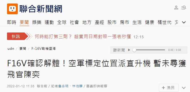 台媒報道截圖 報道稱,F-16V戰機11日於東石鄉水溪靶場訓練出意外,墜落位置在靶場北面,今天陸續尋獲殘骸的地點,也在靶場附近,為北側堤岸往外海1公里,目前為淺海。據報道,台空軍目前標定位置,尋獲飛機本體殘骸,但仍沒發現飛行員,派出空軍救護隊直升機,以吊掛方式優先找飛行員。 另據中時新聞網報道,12日上午10時30分左右,有漁民撿到疑似後方機尾殘骸,隨即交給軍方。該漁民表示,自己沿路走幫忙找,看起來好像有迷彩的圖案,所以把它撿起來,感覺像機板,所以撿起來交給軍方。另有一名鰲鼓濕地導覽員也撿到的碎片,他猜測應是機腹位置。 目前堤防附近土堤搜尋碎片任務已經結束,確認尋獲的是戰機殘骸,飛行員陳奕目前仍下落不明,海軍水下作業小組派員下水尋找;另外直升機在離水溪靶場約100米左右的海面也垂釣2名搜救人員下水搜救。 雅虎新聞報道稱,近午,有蔡姓巡守隊員在岸邊拾獲疑似飛機殘骸;台“行政院”搜救指揮中心12日上午表示,防務部門直升機於上午10時48分疑似發現飛機殘骸及輪胎,11時19分獲防務部門通報,現場確認尋獲飛機本體殘骸,未發現飛行員。