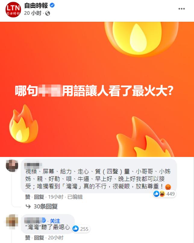 每天就忙著挑起兩岸對立的台灣綠媒,13日也沒有缺席。 13日,島內深綠媒體《自由時報》發起了一項調查,征集網民看了“最火大”的大陸詞匯,最終“灣灣”一詞獲七百多人提名,被頂上熱評。