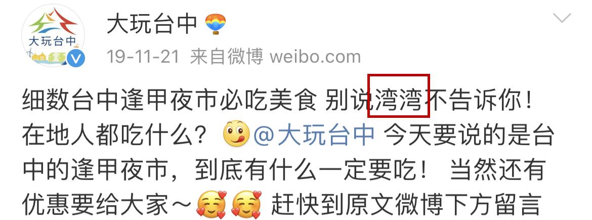 然而大陸釋出的這番情真意切,卻讓島內綠營恐慌不已,他們又宣稱這是大陸的“統戰”作為,不斷洗腦台灣民眾,讓本有著溫暖意義的詞語“灣灣”,硬生生成了個“統戰”詞匯。 比如說,平日裏介紹本地旅遊景點和特色美食的台中市觀光旅遊局(後簡稱“觀旅局”),其面向大陸網友的微博官方賬號@大玩台中 一直以“灣灣”自稱,沒想到這就讓綠營市議員不爽了。