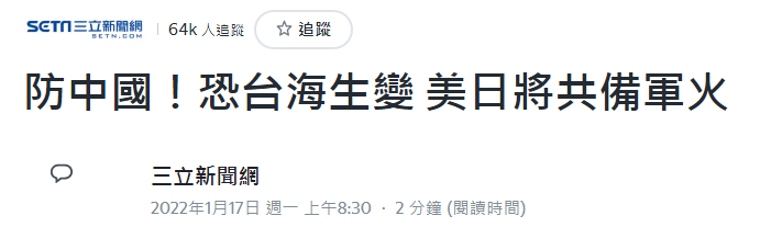 多家台媒援引日媒16日的一則報道稱,繼日前美日“2+2”會談後,兩國正討論在日本各地的防禦設施儲備軍火,包括鄰近台灣的島嶼,以應對可能的突發事件。消息傳出後,島內綠媒迅速炒作,聲稱美日此舉是為應對“台海變故”,不過有一些網友批評稱,“美國到處放火”,“美日是有多希望台海戰火生起來,一直在加油添火”。