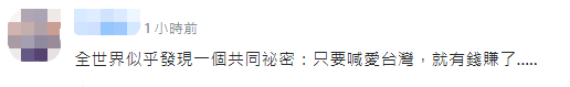 更有人毫不客氣地說,“全世界似乎發現一個共同秘密:只要喊愛台灣,就有錢賺了.....”“是愛台灣的錢吧!不是答應準備經援12億了嗎?”“為了‘台灣’這兩個字,先收朗姆(酒),再喝牛奶,再灌啤酒。專收破爛,這冤大頭當的真窩囊!”