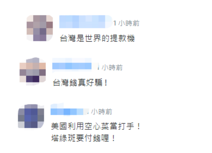 “台灣是世界的提款機”,還有人稱,“台灣錢真好騙!”“美國利用空心菜當打手!塔綠斑要付錢喔!”